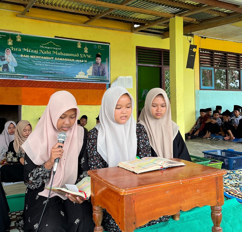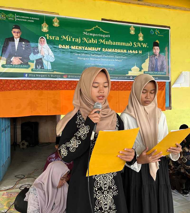 Bungo - (MTsN 4 Bungo) - Dalam rangka memperingati Isra' Mi'raj Nabi Muhammad SAW 1446 H/2025, MTs Negeri 4 Bungo mengadakan acara Peringatan Isra' Mi'raj Nabi Muhammad SAW. Acara Peringatan Isra' Mi'raj Nabi Muhammad SAW diselenggarakan pada hari Jum’at tanggal 07 Februari 2025 di panggung utama depan ruang kelas. Acara ini dihadiri oleh seluruh peserta didik, Bapak/Ibu majelis guru, dan tenaga kependidikan.