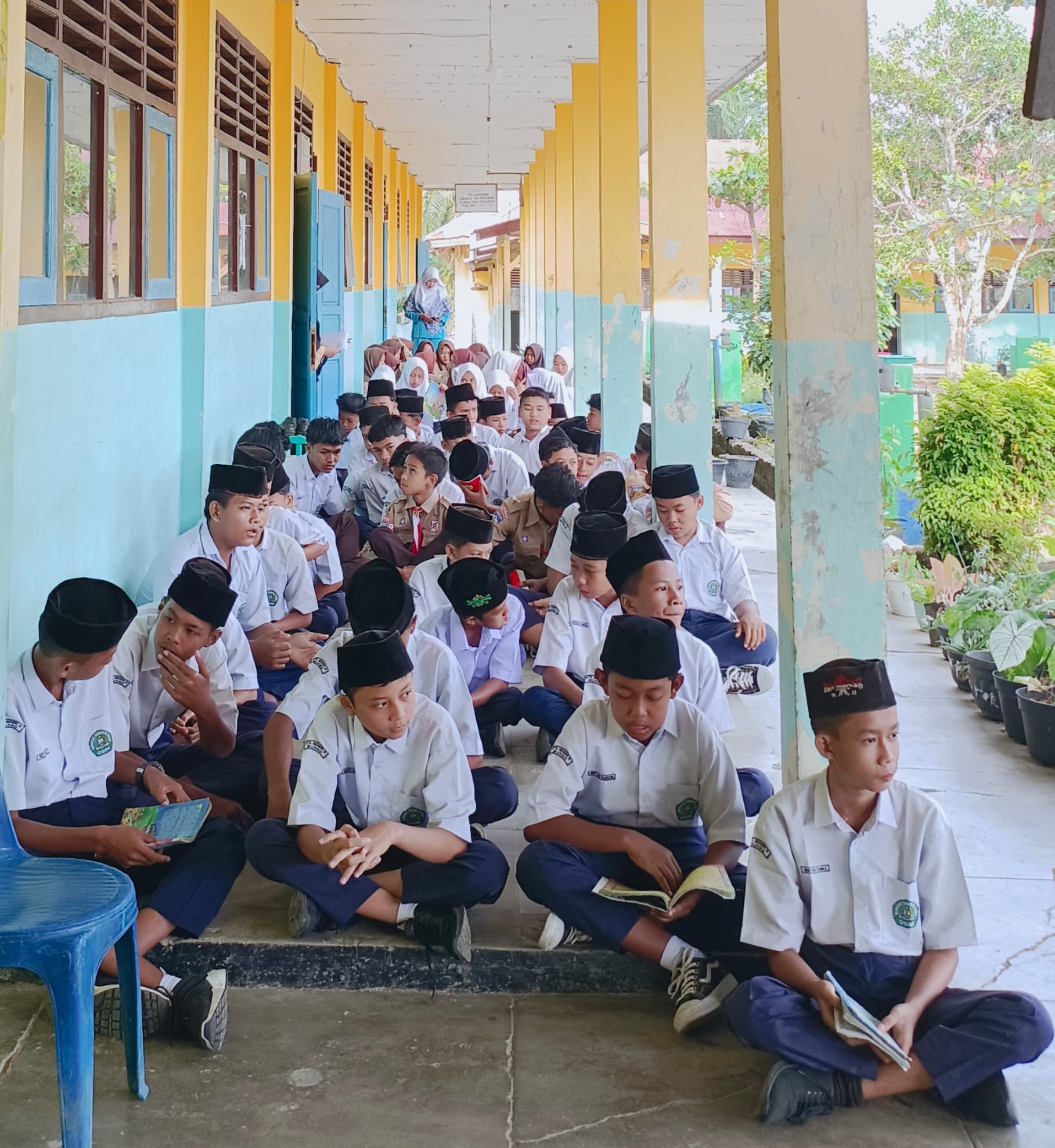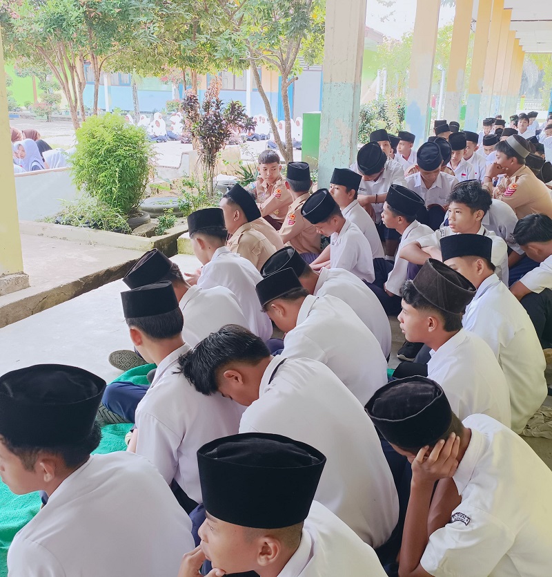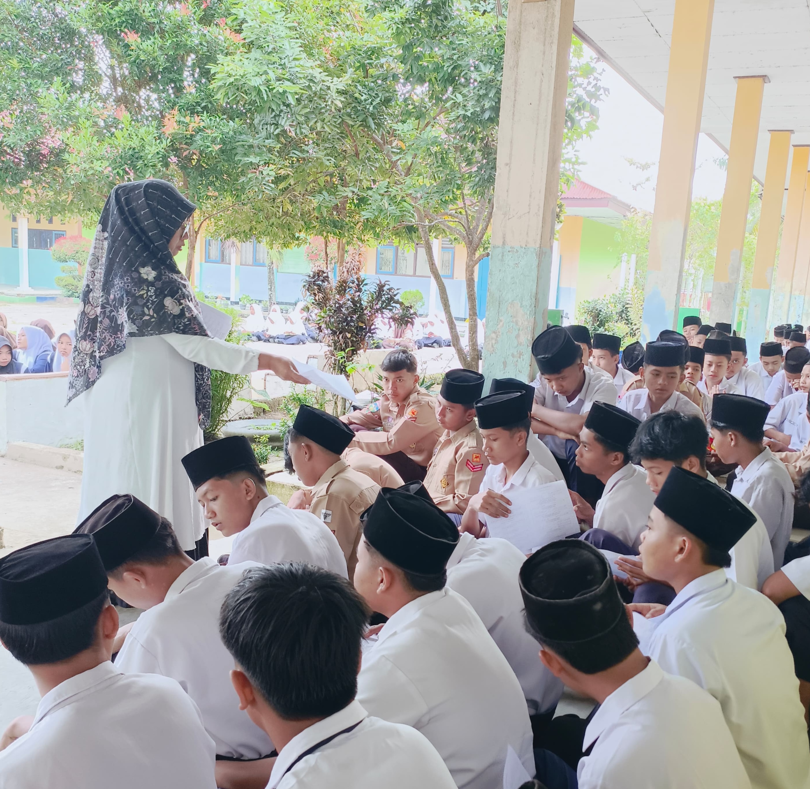 Bungo - (Humas MTsN 4 Bungo) - Pagi yang cerah siswa-siswi MTsN 4 Bungo mengawali dengan kegiatan pelatihan Nazom Amtsilati. Pelaksanaan berlangsung di halaman Madrasah yang di pandu langsung oleh Guru Agama Bapak Slamet Riyadi, S.Pd.I dan dibantu oleh semua guru.
