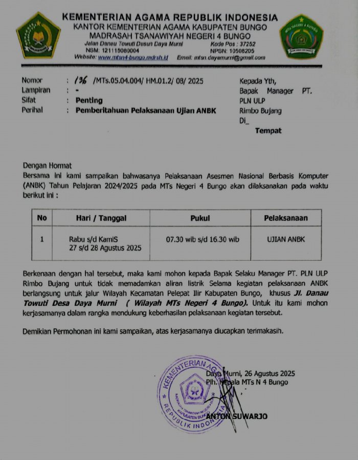 Bungo (MTsN 4 Bungo)-Madrasah Tsanawiyah Negeri 4 Bungo mengambil langkah proaktif menjelang pelaksanaan Asesmen Nasional Berbasis Komputer (ANBK) tahun ini. Pihak Madrasah secara resmi mengirimkan surat kepada PT PLN (Persero) untuk meminta dukungan dalam menjaga kestabilan pasokan listrik selama kegiatan berlangsung.
