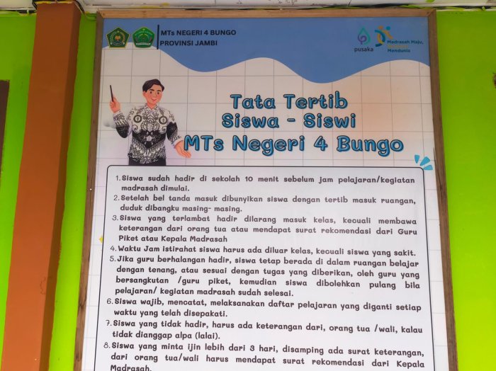 Beberapa poin tata tertib yang menjadi perhatian utama antara lain ketepatan waktu, kerapian dalam berpakaian, sikap dan perilaku, serta kebersihan lingkungan. Siswa diingatkan untuk selalu datang tepat waktu dan mengikuti seluruh jadwal kegiatan madrasah tanpa terkecuali. Selain itu, penggunaan seragam sesuai aturan dianggap sebagai simbol kebanggaan dan identitas siswa MTsN 4 Bungo. Sikap sopan santun kepada guru, teman, dan seluruh warga madrasah juga ditekankan sebagai bagian dari pembentukan karakter. Tidak kalah penting, menjaga kebersihan lingkungan madrasah menjadi tanggung jawab bersama seluruh warga madrasah.