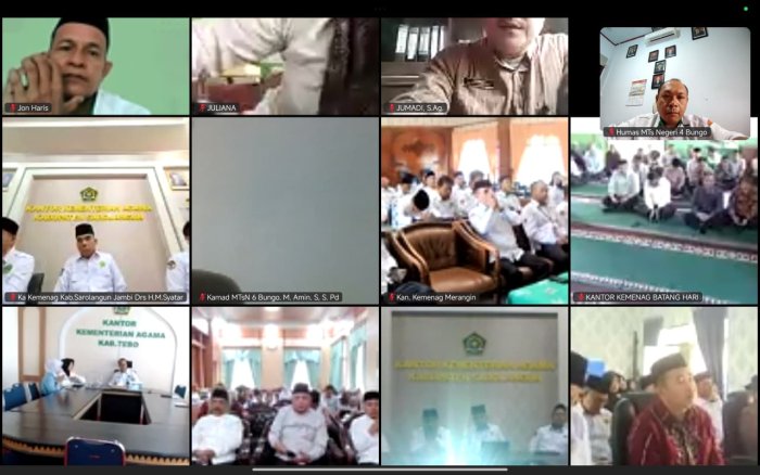 Bungo (MTsN 4 Bungo)-Dalam rangka menghadapi dan merespons perkembangan situasi terkini di Indonesia, khususnya di Provinsi Jambi, Kepala MTsN 4 Bungo, Ahmad Syarif, turut berpartisipasi dalam kegiatan Istigosah (Do�a Bersama) sekaligus Peringatan Maulid Nabi Muhammad SAW Tahun 1447 Hijriah/2025 Masehi. Acara ini digelar secara virtual melalui platform Zoom Meeting, melibatkan berbagai pihak dari lingkungan kerja Kementerian Agama Se-Provinsi Jambi.