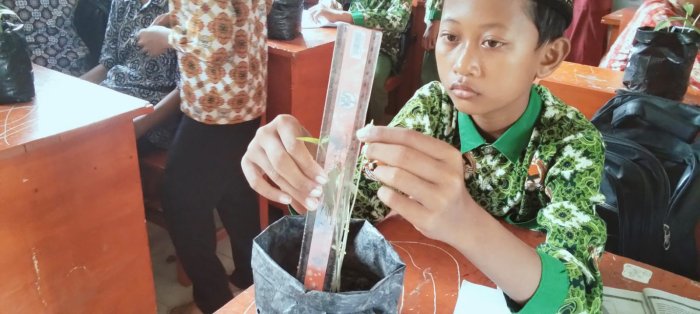 Dalam pelaksanaan percobaan, para siswa didampingi oleh guru IPA yang membimbing mereka memahami peran faktor lingkungan, khususnya cahaya matahari, dalam proses pertumbuhan tanaman. Percobaan ini melibatkan dua kelompok tanaman kacang hijau yang ditanam dalam kondisi berbeda: satu kelompok mendapatkan paparan sinar matahari langsung, sementara kelompok lainnya ditempatkan di area teduh. Seluruh tanaman menggunakan media tanah yang sama agar variabel selain cahaya tetap konsisten.