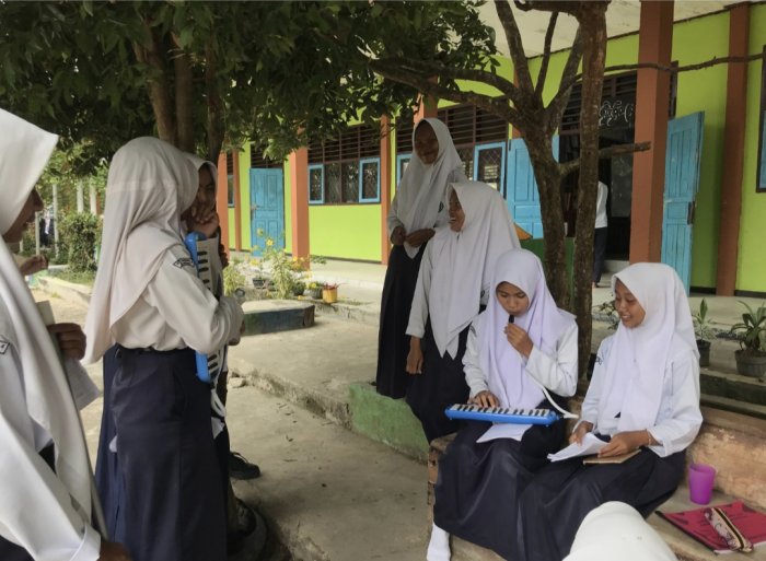 Bungo - (MTsN 4 Bungo) - Siswa Madrasah Tsanawiyah Negeri (MTsN) 4 Bungo melakukan persiapan latihan sebelum pelajaran seni musik dimulai. Kegiatan ini berlangsung di depan kelas, di mana para siswa terlihat antusias menyiapkan alat musik dan perlengkapan yang akan digunakan dalam pembelajaran.