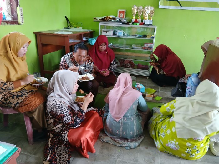 Dengan duduk melingkar dan saling berbagi hidangan yang telah disiapkan, para guru tampak menikmati kebersamaan dalam suasana hangat dan penuh canda tawa. Hadir pula sosok guru yang akrab disapa Pak Rukin, yang menambah kehangatan suasana dengan keceriaan dan sapaan ramahnya.