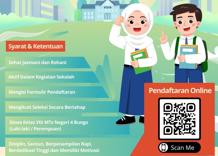Bungo - (MTsNegeri 4 Bungo) - Secara resmi membuka pendaftaran Calon Ketua OSIM (Organisasi Siswa Intra Madrasah), Wakil Ketua OSIM, dan Kabinet OSIM untuk periode 2025/2026. Pendaftaran dibuka mulai 25 s.d 30 September 2025 pukul 15.00 WIB melalui sistem online dengan tujuan menjaring siswa-siswi terbaik yang siap mengemban amanah kepemimpinan serta menjadi agen perubahan positif di lingkungan madrasah.