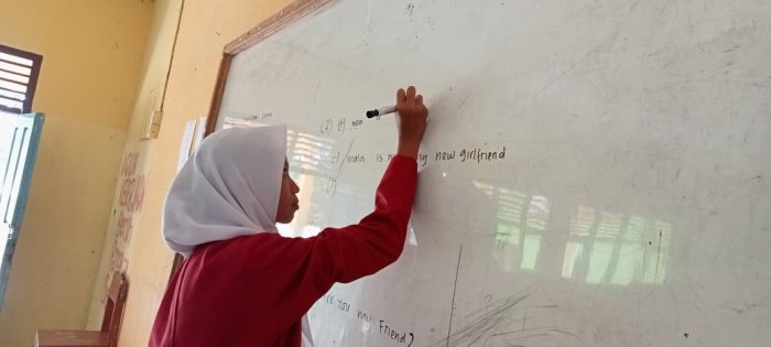 Dengan penuh perhatian, para siswa mendengarkan setiap penjelasan yang diberikan. Mereka juga aktif bertanya ketika menemui kesulitan dalam memahami contoh kalimat yang disampaikan oleh guru. Aktivitas belajar semakin menarik ketika guru memberikan latihan soal untuk mengasah pemahaman siswa terhadap materi yang telah dipelajari.