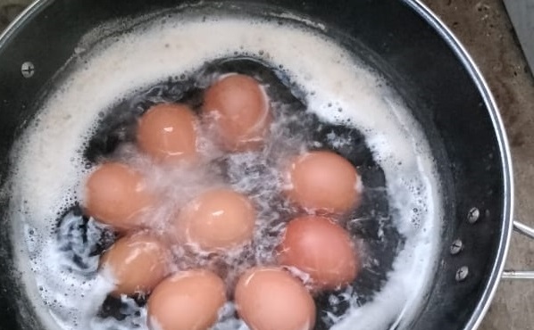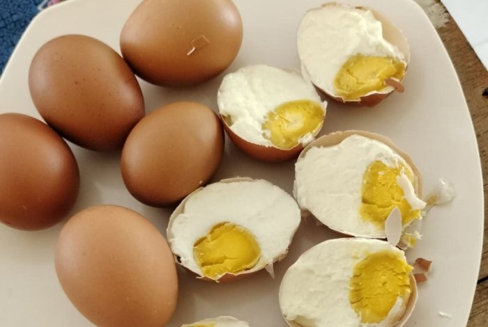 Setelah proses penggaraman selesai, telur biasanya direbus atau dikukus. Pemanasan ini menyebabkan denaturasi protein secara permanen, sehingga putih dan kuning telur menjadi padat sepenuhnya seperti pada telur rebus biasa. Proses pemanasan ini merupakan perubahan kimia yang paling nyata karena struktur protein berubah secara permanen akibat panas.