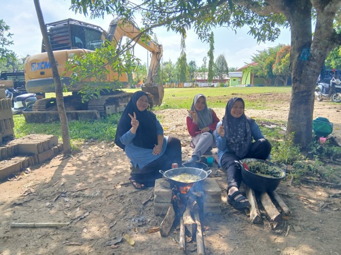 Di sudut lain, suasana keakraban juga tampak saat para ibu guru dengan penuh keceriaan memasak hidangan secara tradisional. Canda tawa yang menghiasi kegiatan tersebut semakin menambah hangatnya suasana, menjadikan momen halal bi halal tidak sekadar seremonial, tetapi juga sarana mempererat hubungan emosional antar sesama.